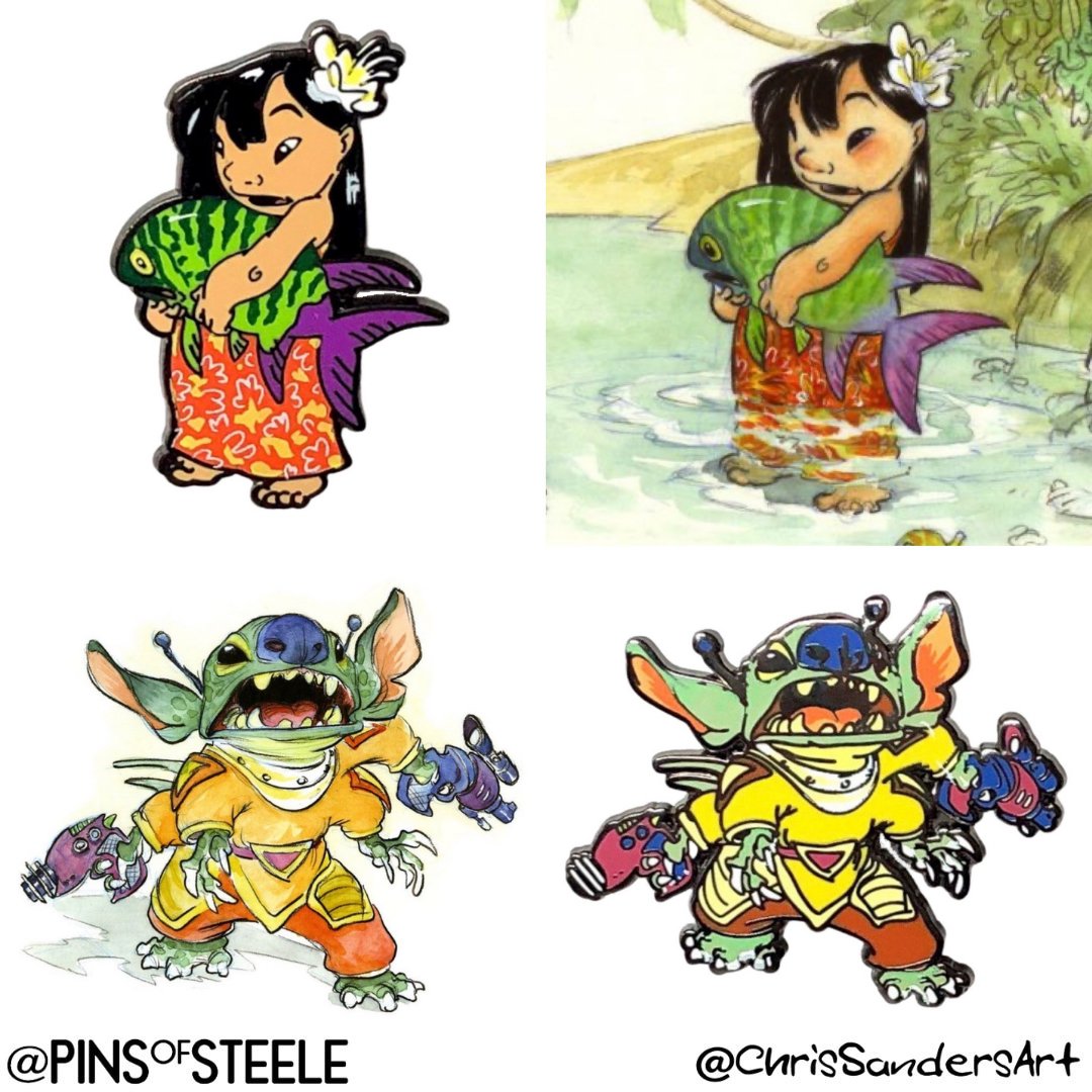 Chris Sanders is the creator, designer, co-writer, and co-director of "Lilo & Stitch,” and he first pitched the concept to Disney in the form of a short watercolor storybook. Disney agreed to make the movie, but on one condition: that it look as though it was drawn in Chris’s unique, easily recognizable personal art style. Chris’s wife Jessica Steele-Sanders produced these pins as an homage to those early illustrations — back when Stitch was green instead of blue!
